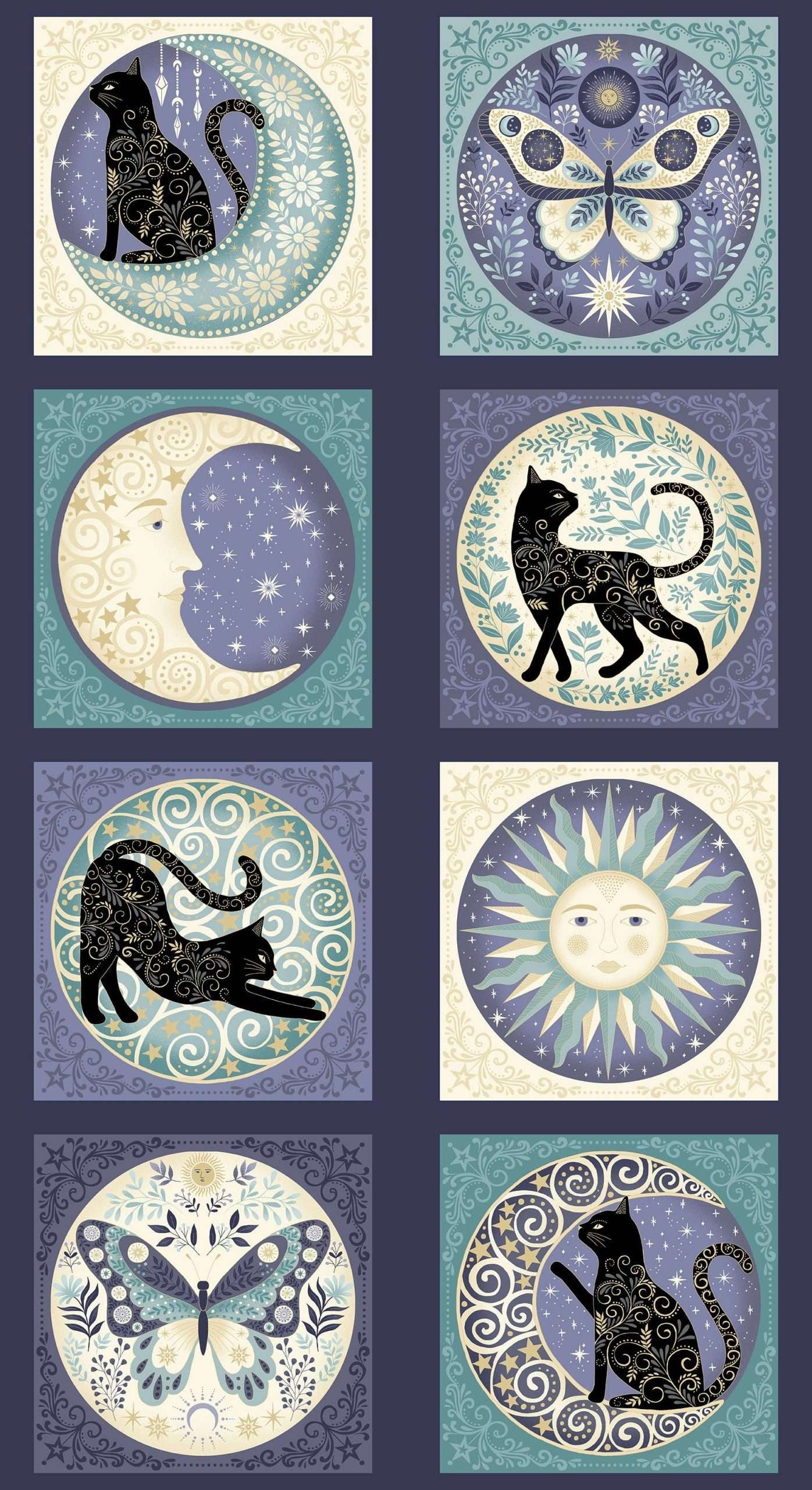 PRECOMMANDE - LIVRAISON EN AVRIL-MAI 2026 Féline et lunaire, une magifique collection de Makower UK. Cette collection met en scène un félin familier lors d'un voyage à travers un royaume nocturne. Avec une palette de couleurs de noir, bleu nuit et crème, les tissus de « Charmed » sont mis en valeur par des accents métalliques dorés pour une sensation enchantée et mystique.